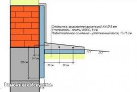Каждый метр горизонтальной изоляции от стены соответствует почти такой же изоляции вглубь от поверхности. Почти, потому что надо учитывать некоторые дополнительные потери тепла через саму толщу теплоизоляции, которая целиком находится на границе среды с уличной температурой. В случае же вертикальной изоляции с увеличением глубины растет и средняя температура почвы. Если по какой-то причине невозможно предусмотреть сколько-нибудь играющую роль горизонтальную теплоизоляцию, то утеплить фундамент дома можно обычным вертикальным утеплением, но её желательно сочетать так же утеплением с внутренней стороны верней части фундамента и пола первого этажа.