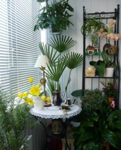 Если Вы любите комнатные растения, а в квартире недостаточно места, можно устроить оранжерею для цветов на балконе. Вдоль всего остекления установить подоконник, на котором Вы сможете поместить необходимое количество цветов. А на стенах повесить кашпо, из которых будут свисать вьющиеся растения. Все «комнатные любимцы» будут в одном месте, и Вам будет удобно ухаживать за ними: поливать, рыхлить, удобрять. Цветы будут радовать Вас своим внешним видом, а воздух наполнится приятным благоухающим ароматом.